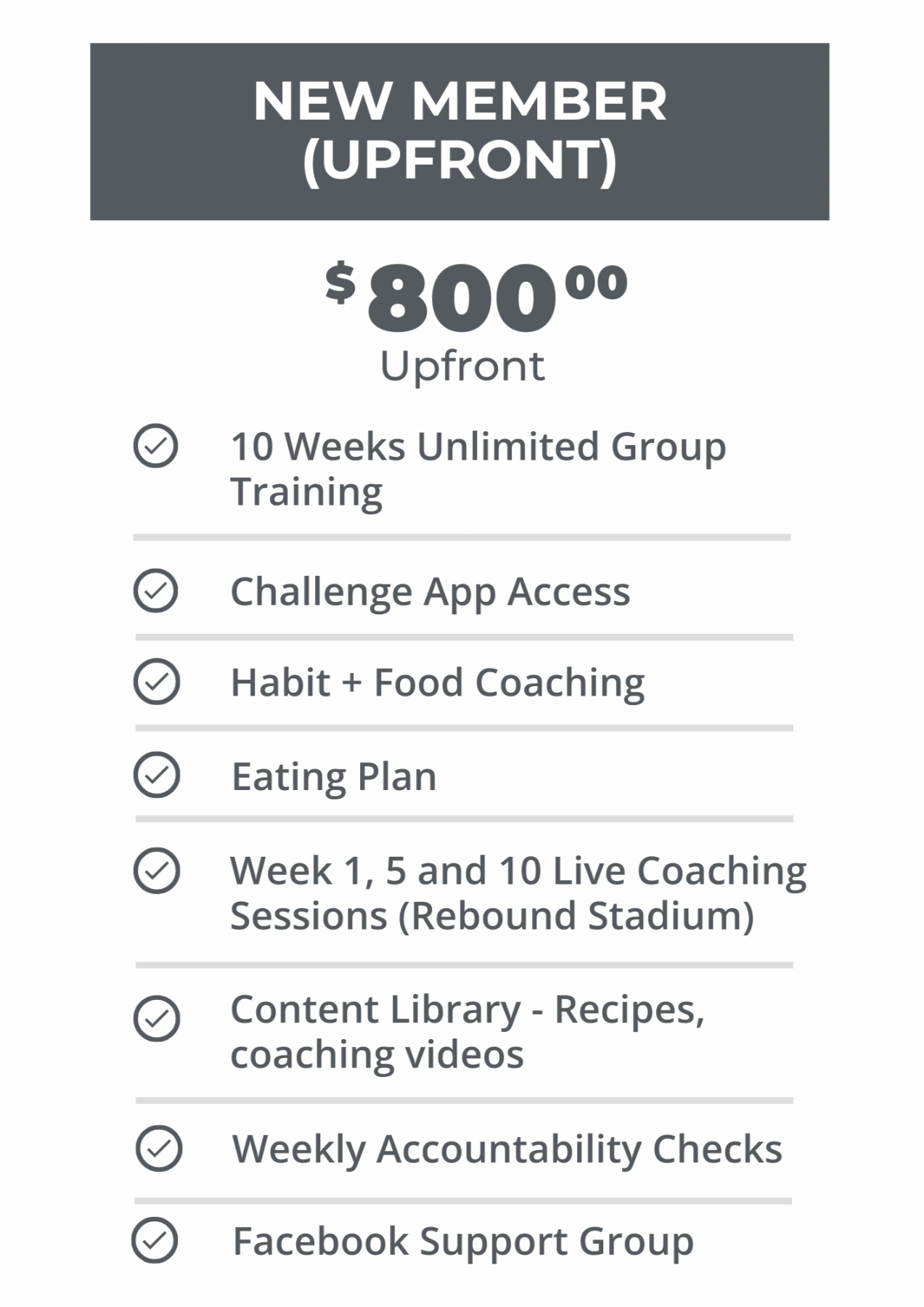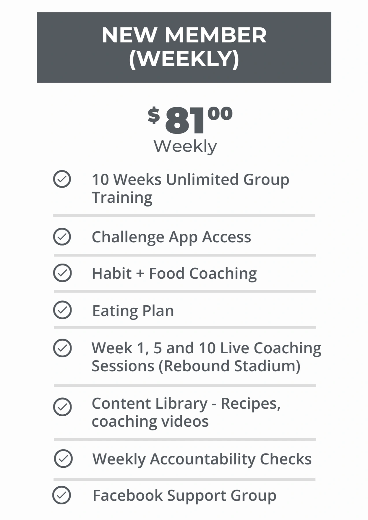 The training element to the challenge is our group training program. So when you join The Challenge, you get unlimited access to the group training timetable PLUS you get all of The Challenge features – ie, group coaching sessions at Week 1, Week 5 and Week 10, accountability and support.